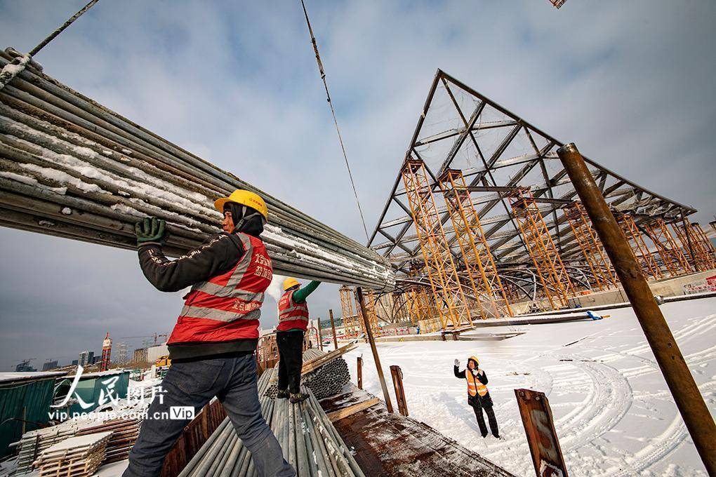 2023年12月11日,副中心枢纽工程,工人在进行钢筋起吊运输作业。
