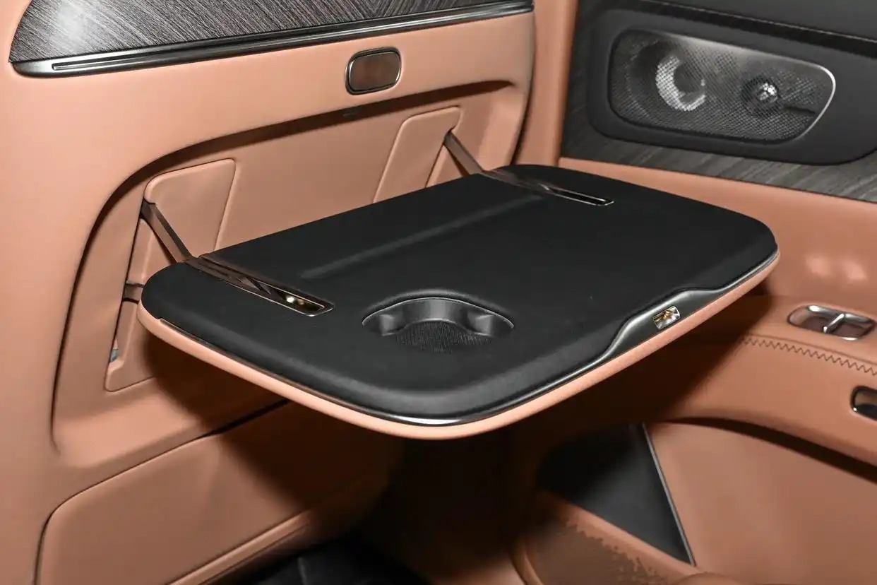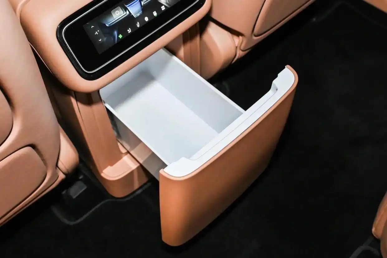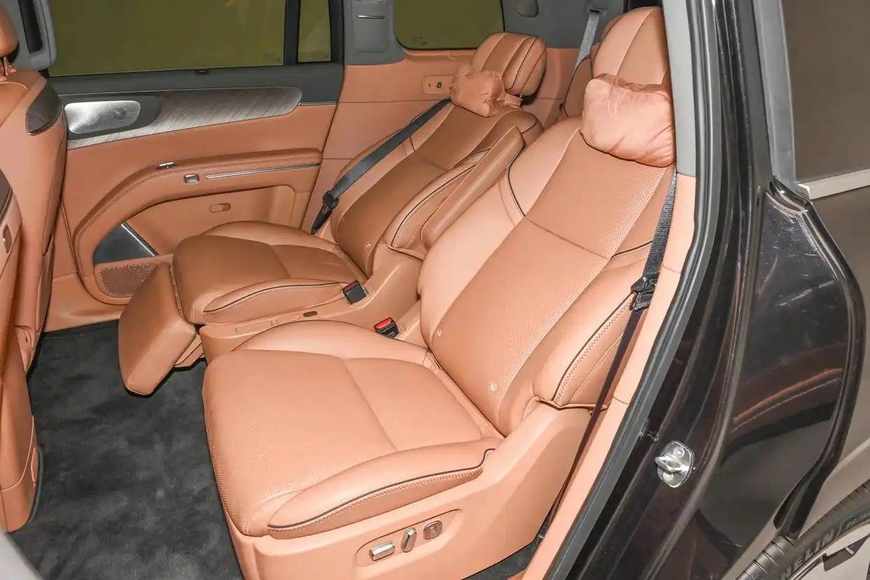 座椅方面,除了纯电车型提供一款7座车型外,其余车型都是2+2+2的6座布局,第二排右侧是零重力座椅,支持一键零重力模式,想要座椅加热/通风/按摩都可以,还带有腿托调节,乘坐体验十分舒适。还能看到,该车提供车载冰箱、后排小桌板和后排吸顶娱乐屏幕等。