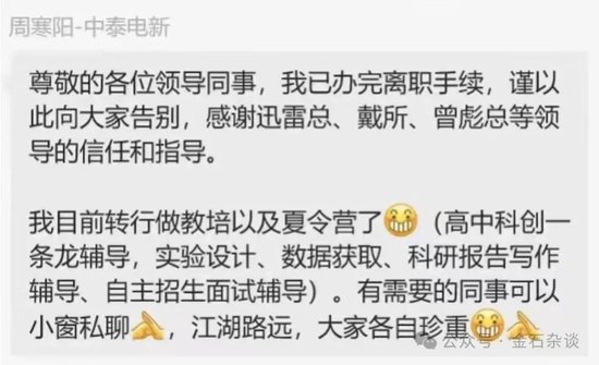 彼时,金石杂谈写道,中泰电新研究员周寒阳转行教培主要是高中科创一条龙辅导,实验设计、数据获取、科研报告写作辅导,这不都是分析师擅长的领域吗?