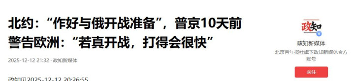 政知新媒体:北约:“作好与俄开战准备”,普京10天前警告欧洲:“若真开战,打得会很快”