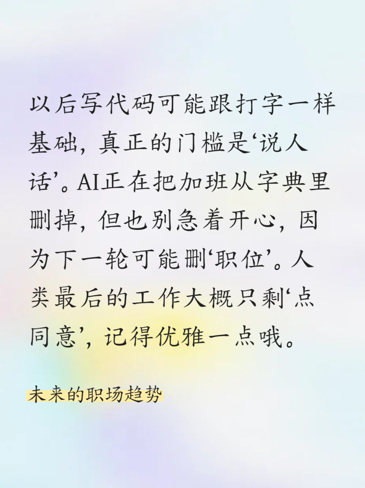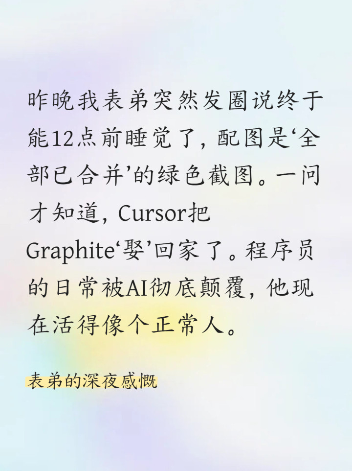 “写代码→提PR→等评审→改Bug→再提交……这套折磨打工人的流水线,被Cursor一口吞掉。看完这篇,你会明白:为什么有人能准点打游戏,你却天天熬夜;为什么AI不是来抢饭碗,而是来递枕头。3分钟,听懂未来程序员的新日常。”